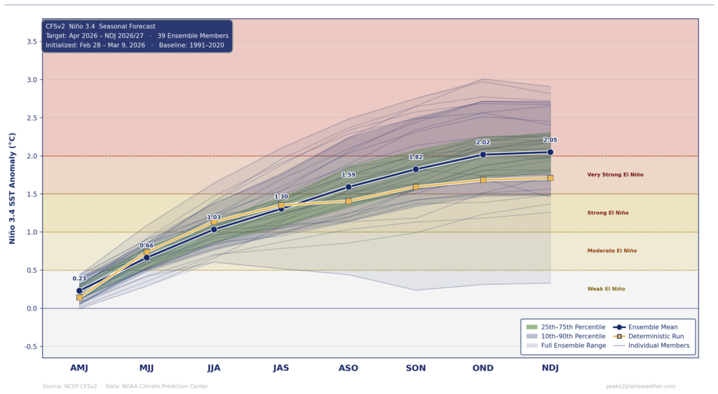 Here’s where things actually stand. We’re coming out of a fading La Niña, and the ocean heat below the surface in the equatorial Pacific is actually impressive. NOAA puts about a 62% chance of El Niño emerging by June–August, climbing to 72–80% by fall. BUT there’s only about a 1 in 3 chance it reaches “strong” status by October–December. A moderate El Niño is equally — maybe more — likely.