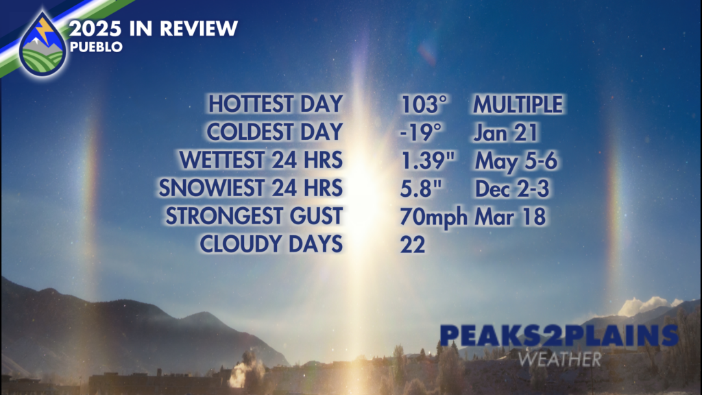 In Pueblo we were gustier, snowier, and wetter than Colorado Springs. We also had fewer straight cloudy days. That December storm? Yep – that was the snoiwest “day” of the year in Pueblo too. Who knew?