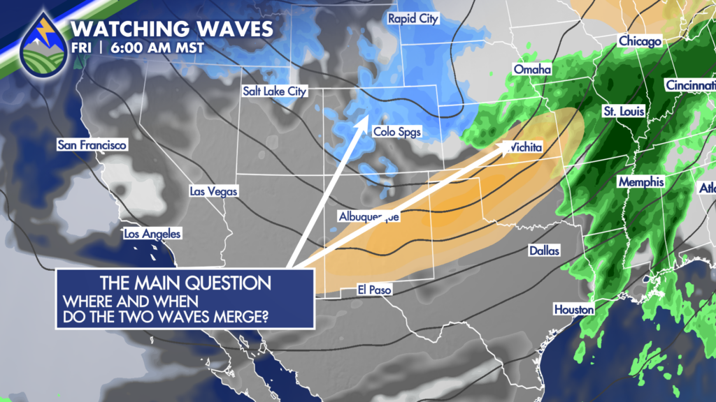 We’re getting indications that these systems will eventually congeal and merge. Our questions to focus on over the next several days are does this merging happen over the Rockies or just to the east. It’s a really important detail. If you want snow east of the mountains in southern Colorado you best be rooting for these system to merge closer to home than over Nebraska and Kansas.