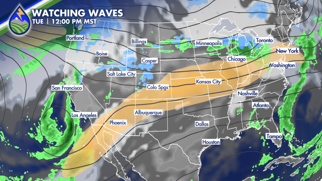 LATE WEEK STORM POTENTIAL: Two waves will move across the western U.S. A lead wave that moves from the southern Coast of California across the U.S. and Mexico border through New Mexico before at some point it starts kicking to the northeast. The second wave comes in behind it from the northwest.