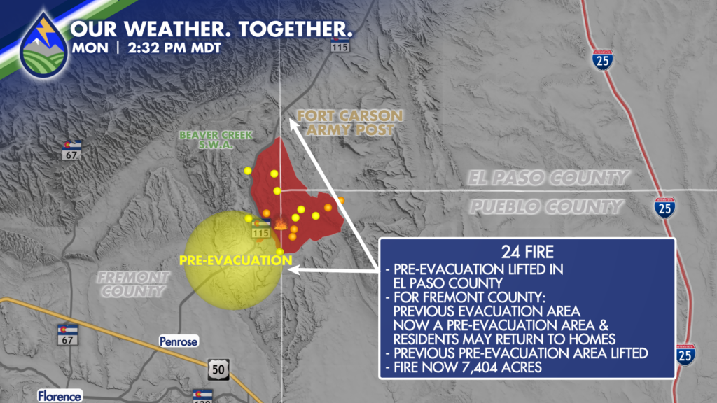 The El Paso County Sheriff just lifted the pre-evacuation for the southwestern part of El Paso County on highway 115 for Sandy Creek Heights.
