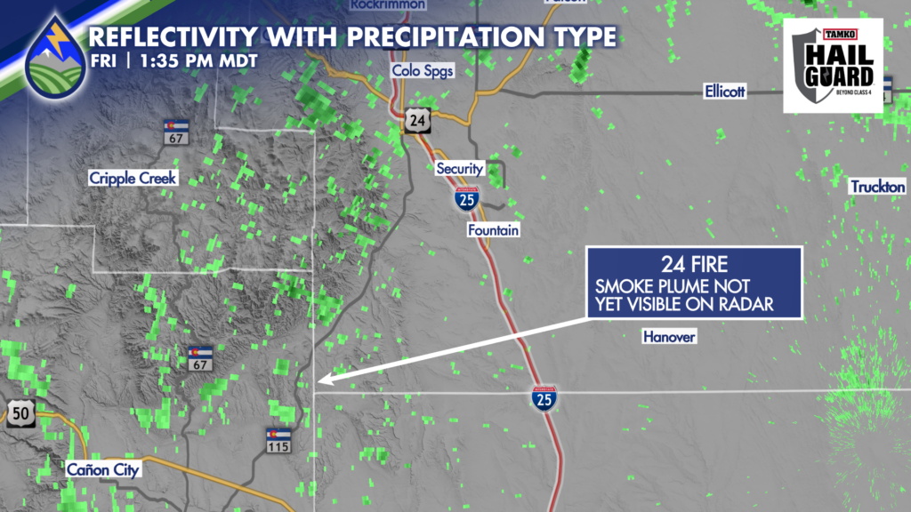 24 FIRE UPDATE, FRIDAY 1:45PM: The fire is now more than 1,000 acres. A diffuse plume is visible as of this writing, but the characteristics of the smoke plume are not as active as it was 24 hours. It’s also not visible as of this post on radar. Wind is variable in the area and mainly under 15mph.