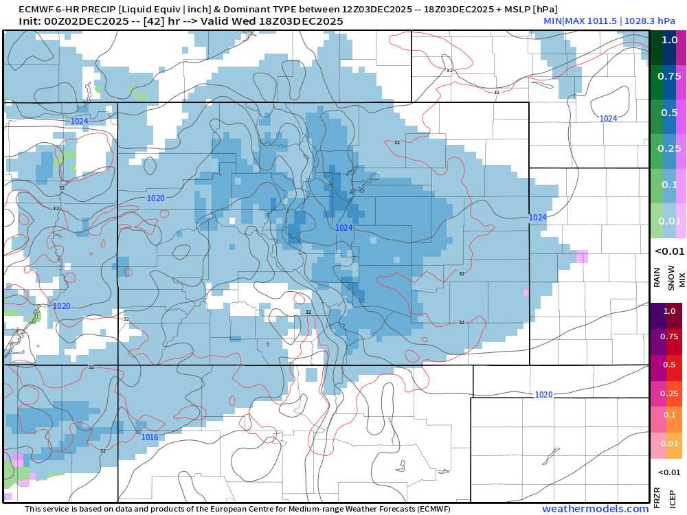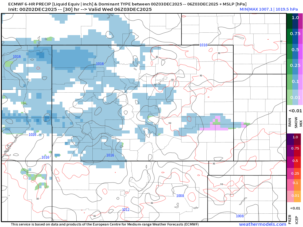 The upper level wave ends up along the Utah/Colorado border early Wednesday, bringing west-southwest flow between 13,000-18,000′ over the top of some colder air sliding down the Front Range. This is a classic pattern that produces “over-running” or isentropic upglide on the more formal side of things. This is a nice general ramp of lift on the large scale that will combine with typical terrain effects to produce some localized areas of enhancement. There will be some enhancement on the west and southwest facing slopes over the ski resorts ahead of the heart of the upper-level system, but even better terrain enhancement will occur along the eastern slopes of the Rockies.