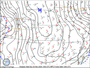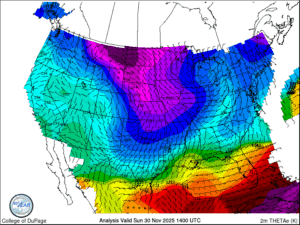 There is a large and cold airmass over the central plains of the United States on the final day of November. A plot of surface Theta-e values over the U.S. and surface wind barbs really help show the extent of the current arctic airmass over the country.