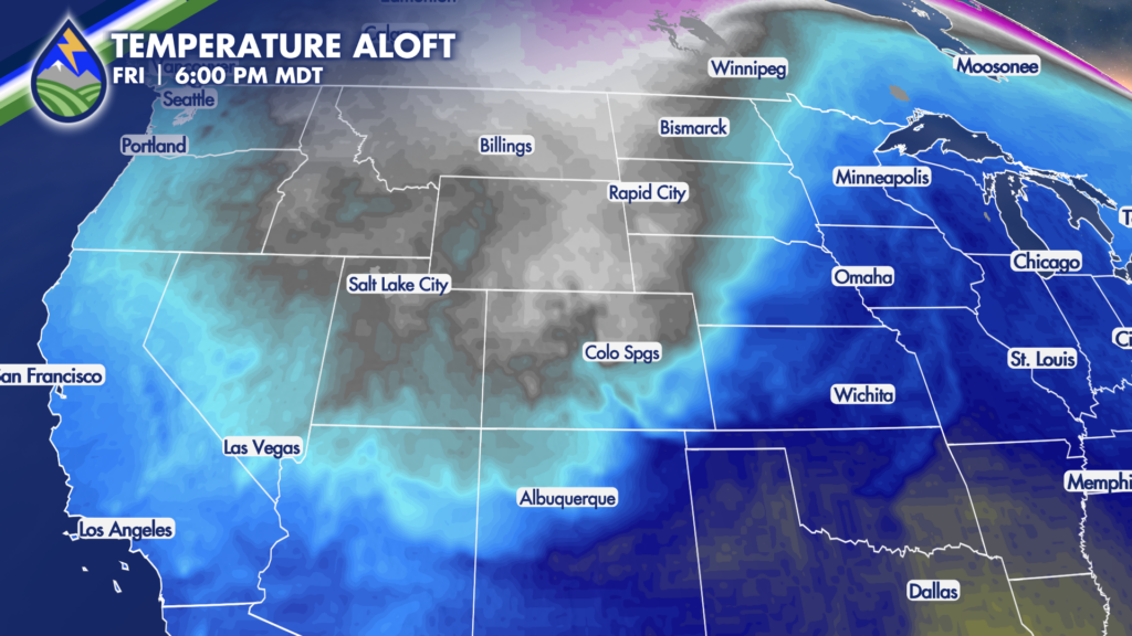 The second storm of the week is colder than the first one. Temperatures in the mid-levels of that atmosphere at about 10,000′ drop very quick on Friday. From about 36° as the day begins to 12° by dinner. That drop and those numbers would get snowflakes going, even in the heart of Colorado Springs, Friday afternoon.
