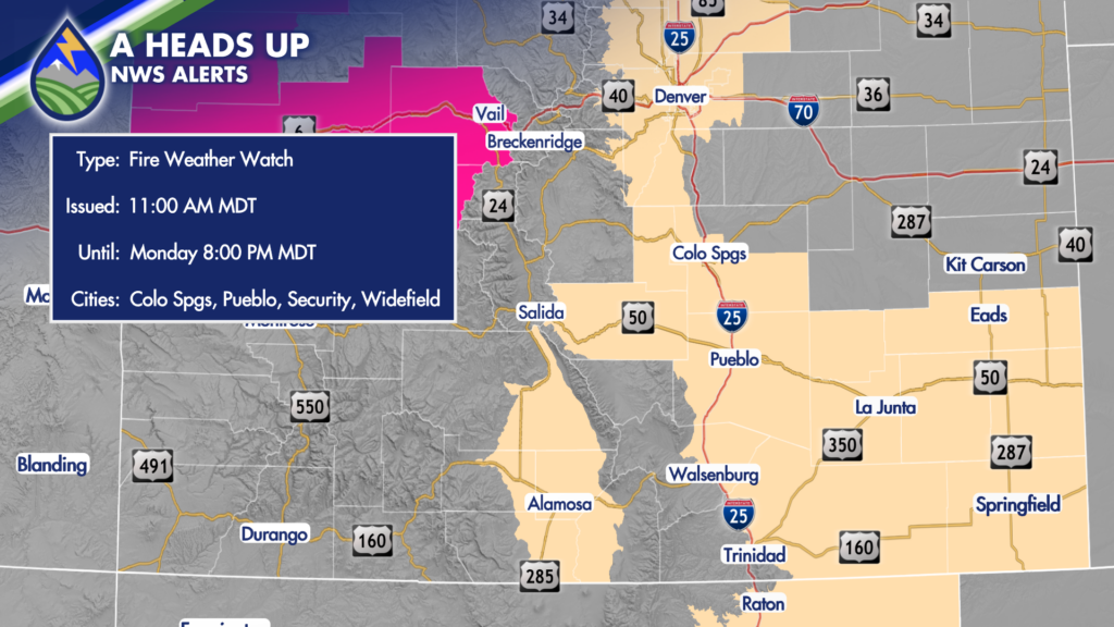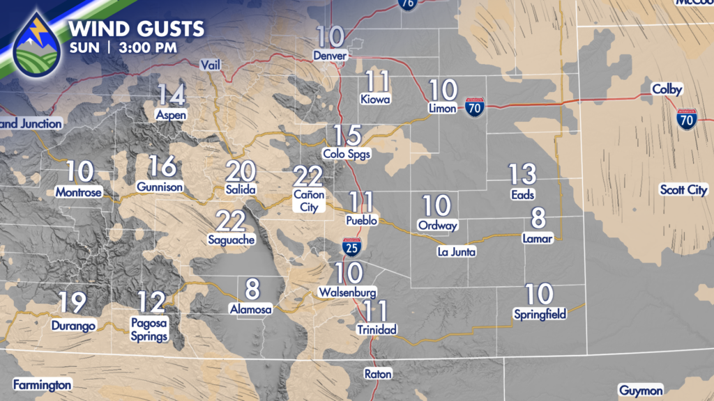 LESS WIND SUNDAY: Wind picks up on Monday out of the west and that one sharp difference increases fire danger. My friends at US National Weather Service Pueblo Colorado rightfully have a Fire Weather Watch up for Monday, they’ll upgrade it to Red Flag Warning – probably in the middle of our Sunday. Be on the lookout for that here. Gusts Monday will be between 25-40mph over the mountains and slopes and 20-25mph east of the Rockies in the afternoon.